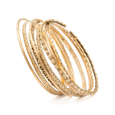 Consisting of eight bangle bracelets with various designs. 7 7/8-8 inches inner circumference.