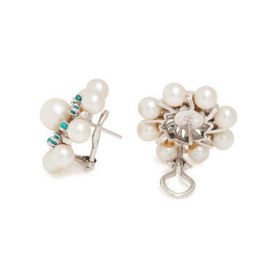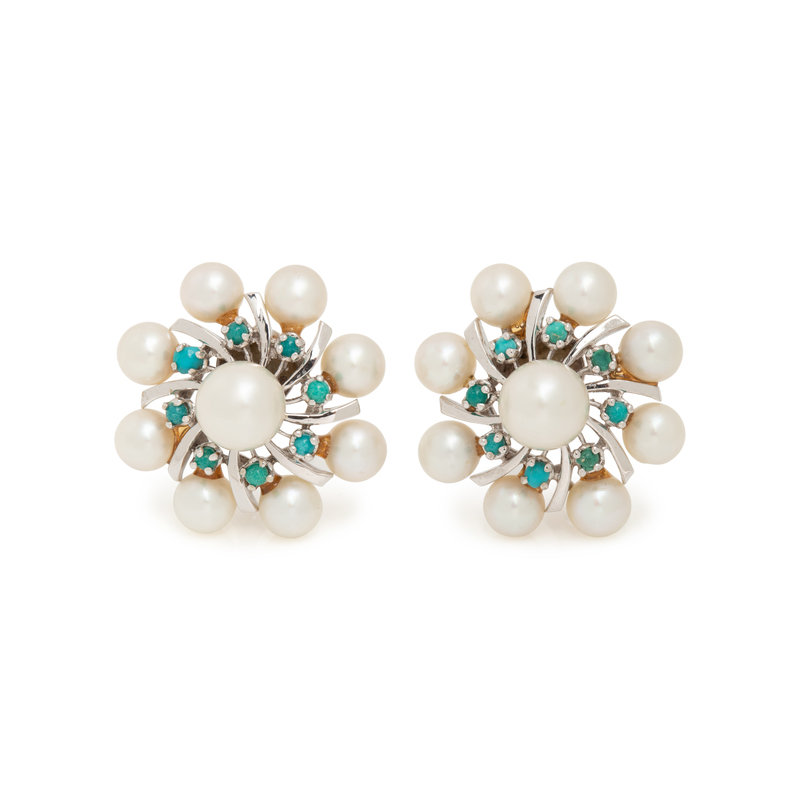 Containing 18 pearls measuring approximately 5.50-7.70 mm in diameter and 16 round cabochon turquoise, posts with clip backs. Mounted in white gold. 1 inch wide.