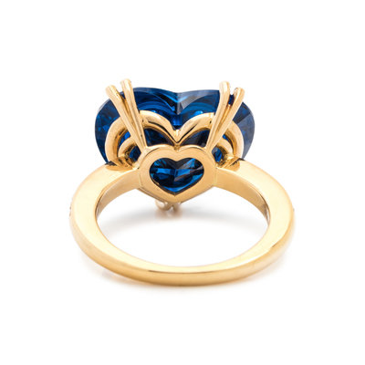 Consisting of a glazed compartment enclosing three freely moving bezel set round brilliant cut diamonds inside a heart shaped blue crystal measuring approximately 16.00 x 14.00 mm and 12 round brilliant cut diamonds. Mounted in yellow gold. Ring size 6 1/2.