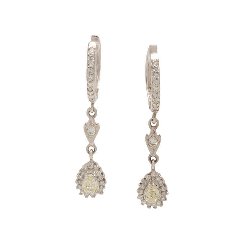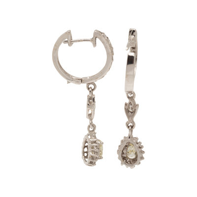 Containing two pear shaped colored diamonds (origin of color not tested) and 52 round brilliant cut diamonds weighing approximately 1.40 carats total. Mounted in white gold. 1 5/8 inches long.