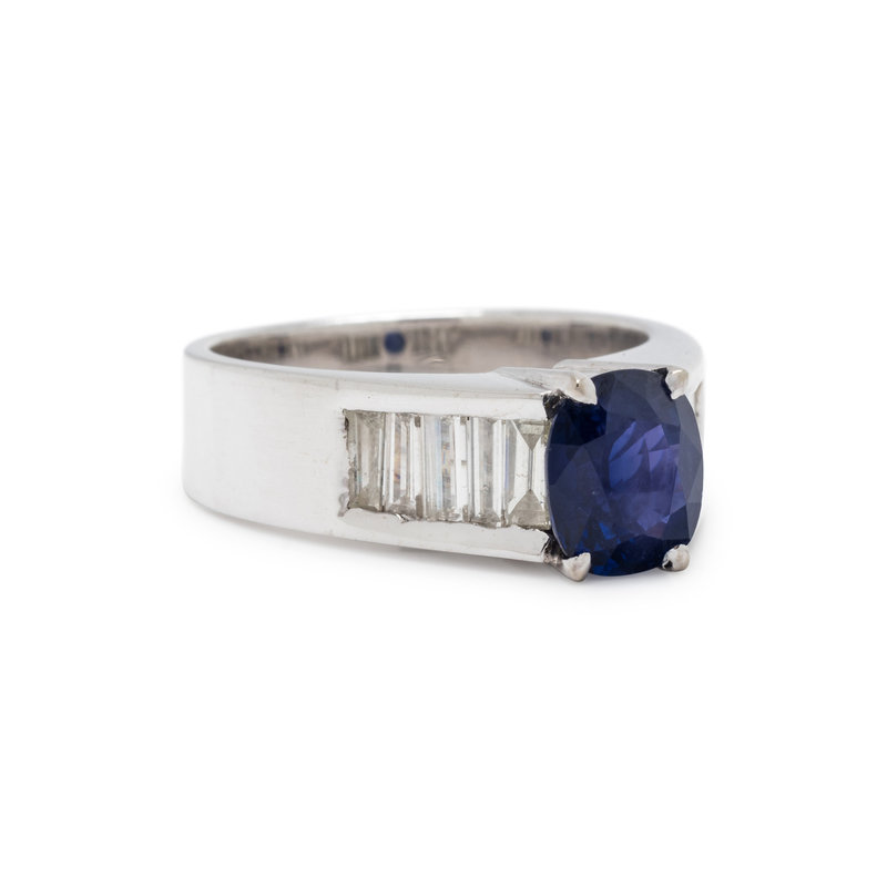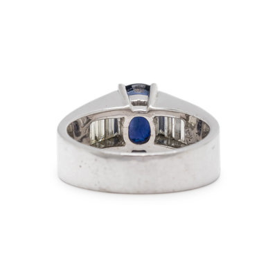 Containing one oval mixed cut color change sapphire measuring approximately 7.85 x 7.00 x 4.20 mm and 10 baguette cut diamonds weighing approximately 1.10 carats total. Mounted in white gold. Ring size 6 1/2.