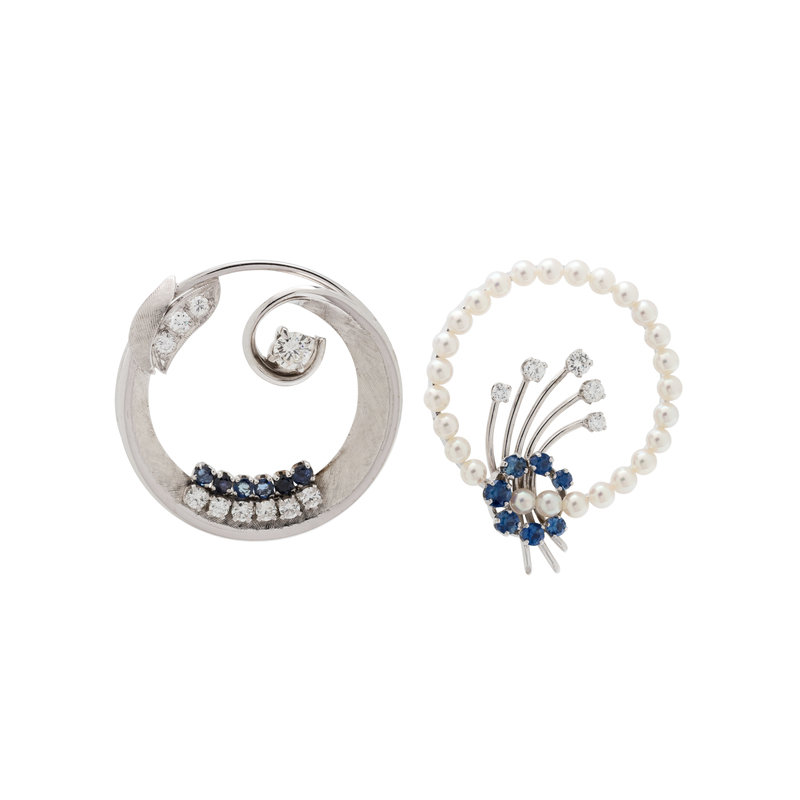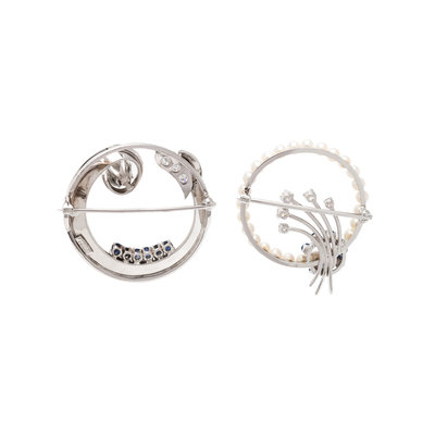 Consisting of a brooch containing 10 round brilliant cut diamonds weighing approximately 0.75 carat total and six round sapphires, together with a brooch containing five round brilliant cut diamonds, seven round mixed cut sapphires and a cultured pearl surround. 1 1/4 and 1 1/8 inches wide.