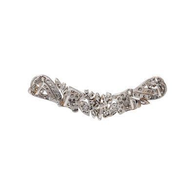Containing 97 round brilliant and single cut diamonds and eight marquise cut diamonds weighing approximately 4.00-5.00 carats total. Mounted in white gold. 1/2 inch x 2 1/2 inches.