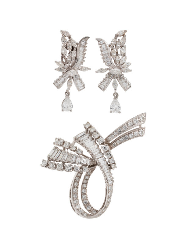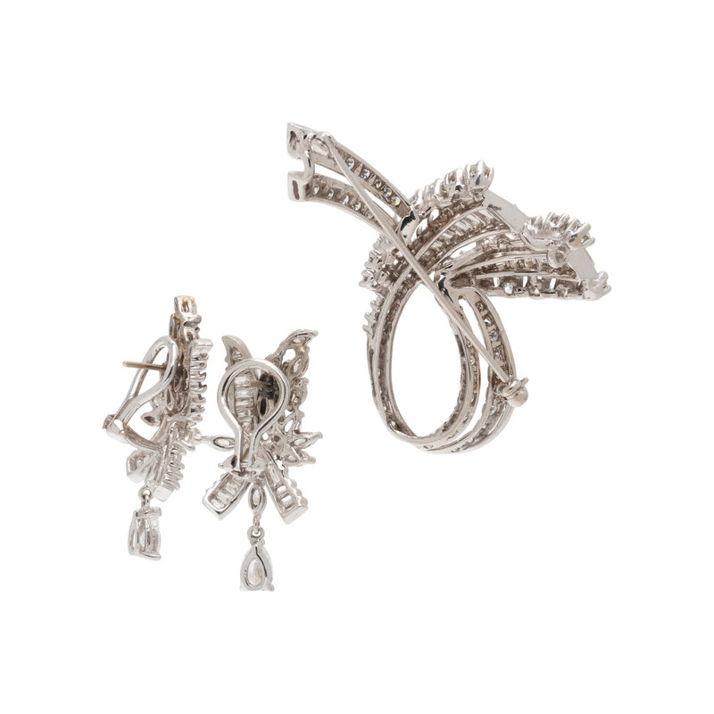 Consisting of a brooch containing 59 round brilliant and 24 baguette cut diamonds weighing approximately 3.45 carats total, together with a pair of earclips containing two pear shaped, 25 marquise cut and 30 baguette cut diamonds weighing approximately 3.00 carats total. Mounted in white gold. Brooch: 1 7/8 x 1 1/4 inches. Earclips: 1 1/8 inches long.