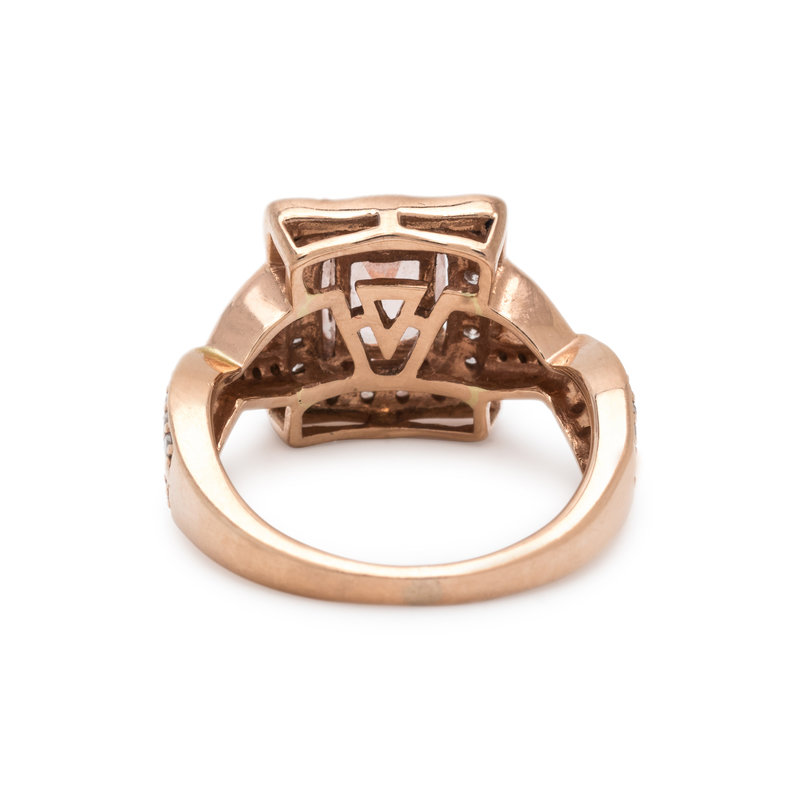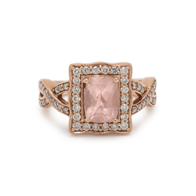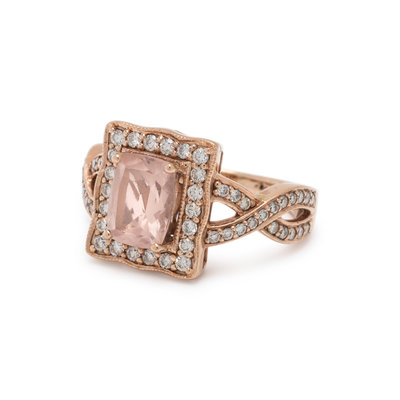 Containing one cushion mixed cut morganite measuring approximately 8.00 x 6.00 mm and 60 round brilliant cut diamonds weighing approximately 0.40 carat total. Mounted in rose gold. Ring size 5 3/4.