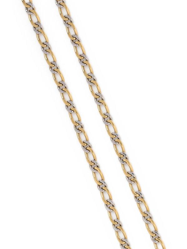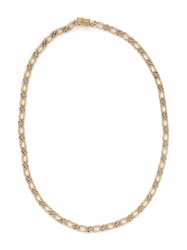 Consisting of a figaro link chain measuring approximately 4.90 mm wide with alternating white and yellow gold links. 16 1/2 inches long.