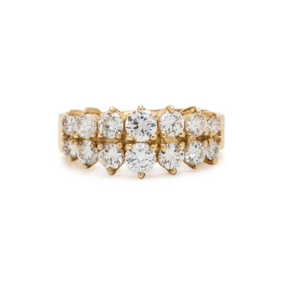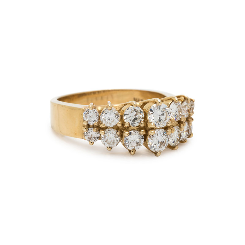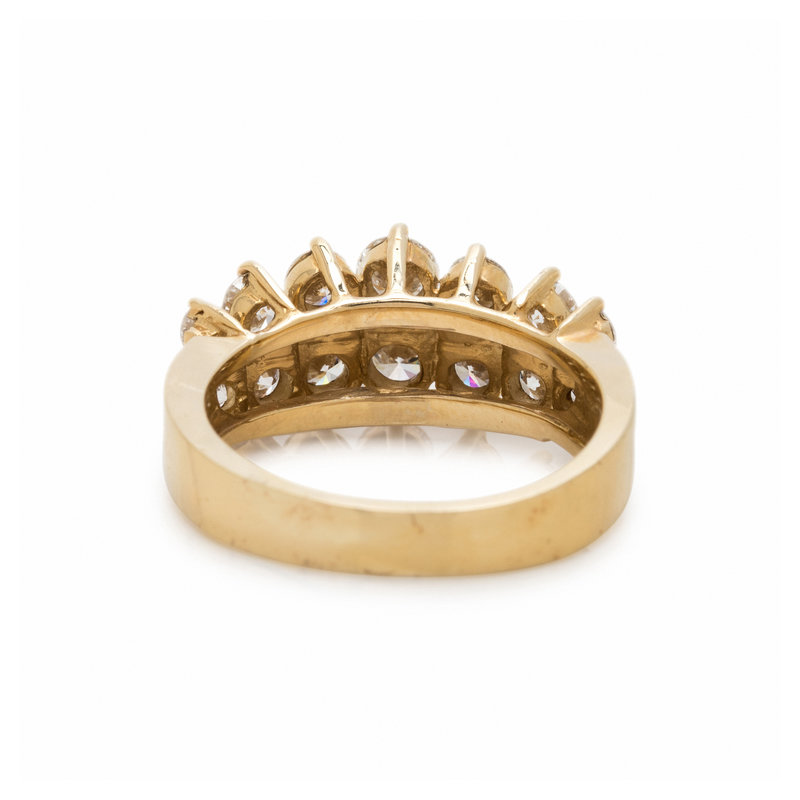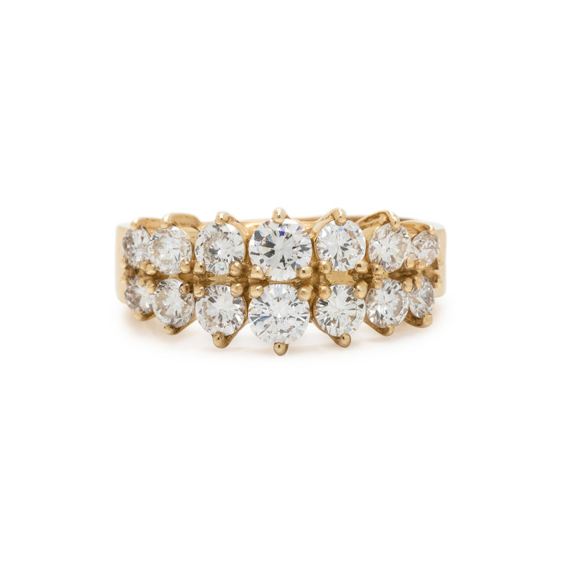 Containing 14 round brilliant cut diamonds weighing approximately 1.85 carats total. Mounted in yellow gold. Ring size 7 3/4.