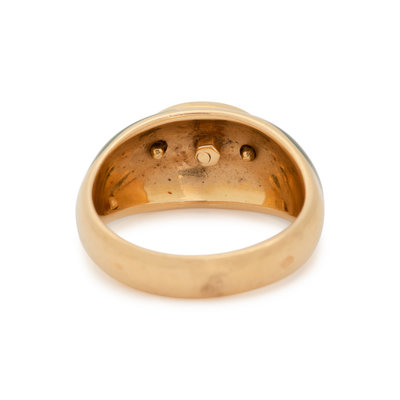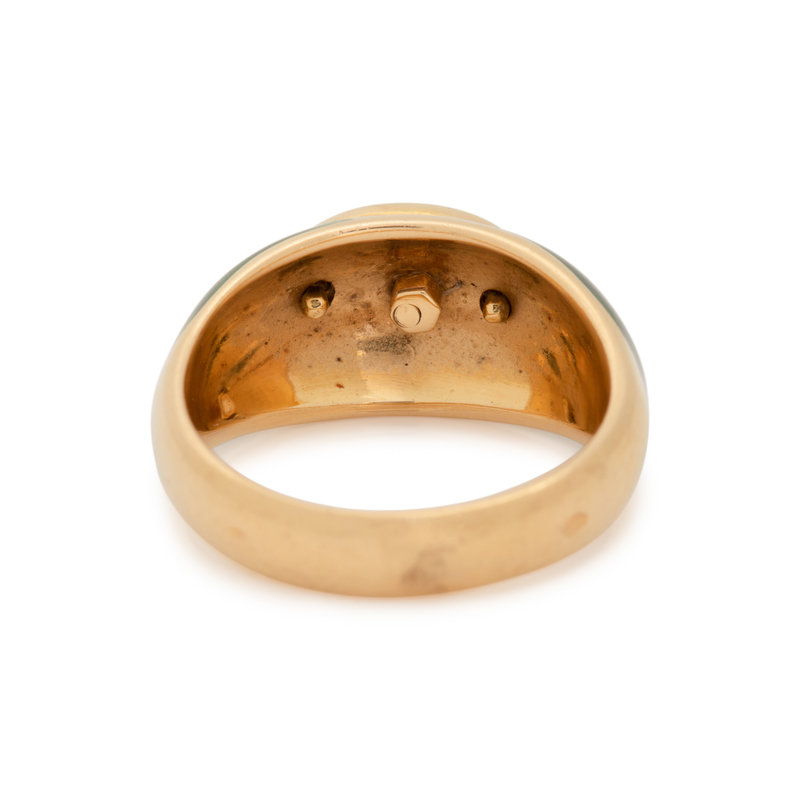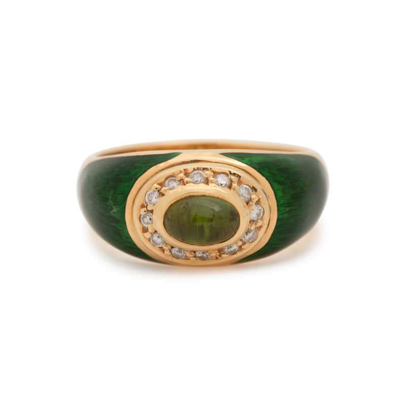 Containing one oval cabochon peridot, 12 round brilliant cut diamonds weighing approximately 0.10 carat total and green enamel shoulders. Mounted in yellow gold. Ring size 6 1/4.