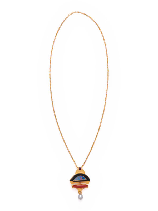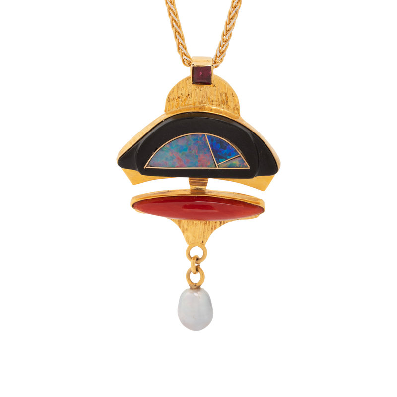 Consisting of a pendant containing one marquise cabochon coral, one square step cut gemstone, inlaid opal with onyx surround and one cultured pearl drop, suspended from a wheat chain necklace. 23 3/4 inches long.