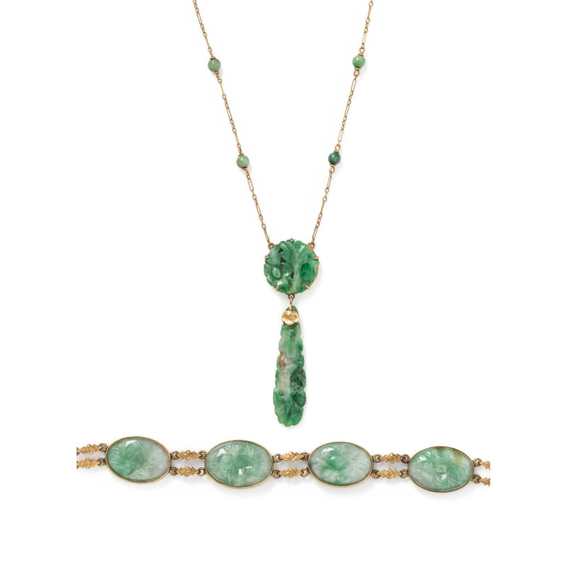 Consisting of a necklace containing a carved and pierced jade pendant suspended by a fancy link chain with four jade beads, together with a bracelet containing six oval carved jade plaques. Necklace: 14 inches long. Bracelet: 7 1/2 inches long.