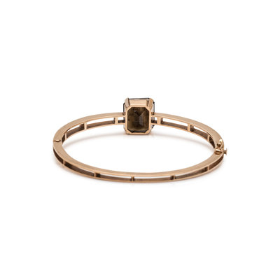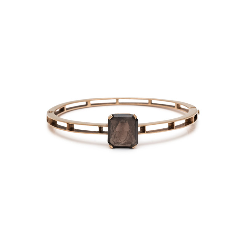 Containing one rectangular smoky quartz intaglio depicting a family crest, hinged with side clasp. 6 1/2 inches inner circumference.