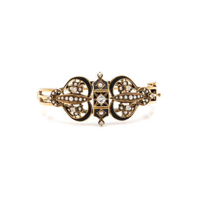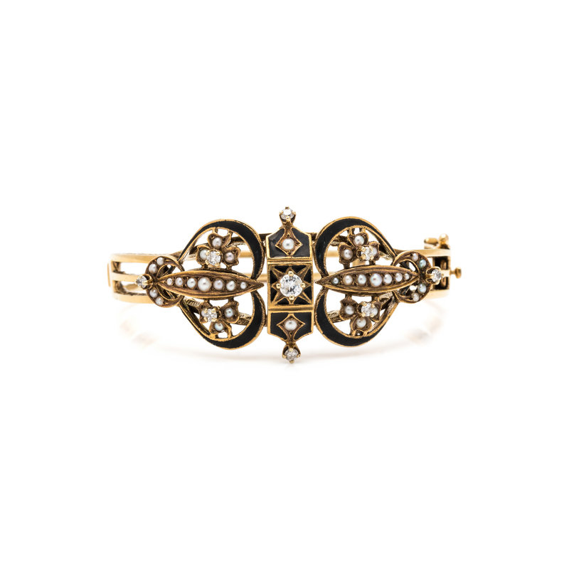 Containing nine round brilliant cut diamonds weighing approximately 0.45 carat total, numerous seed pearls and black enamel detail, hinged with side clasp. 5 3/4 inches inner circumference.