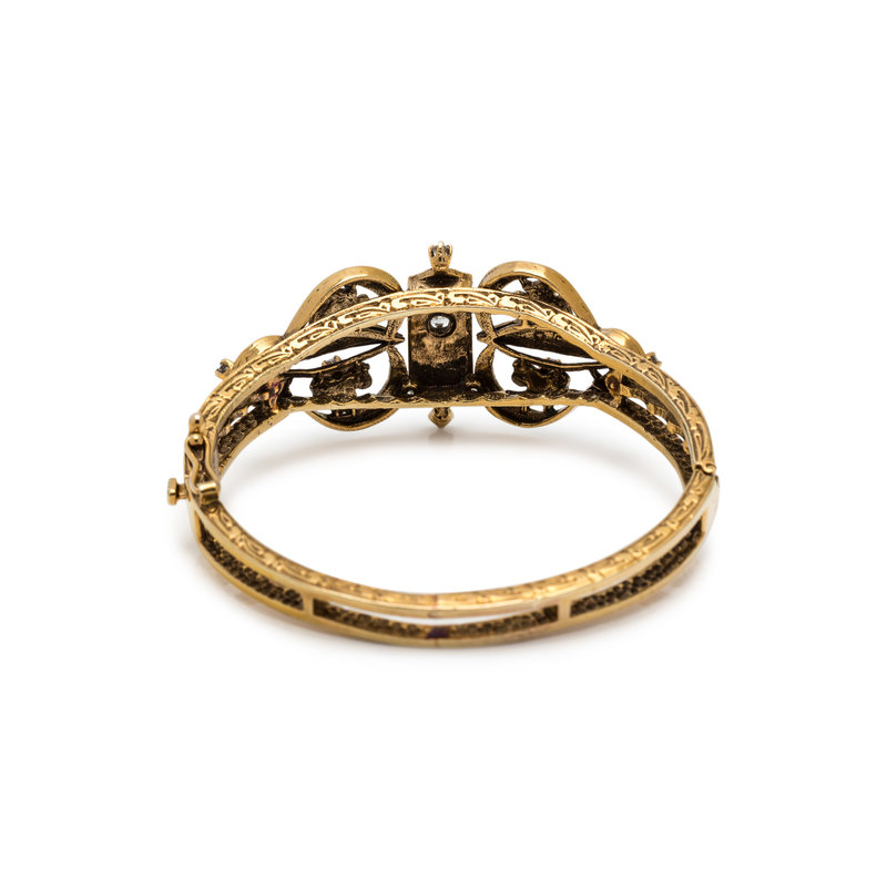 YELLOW GOLD, DIAMOND, SEED PEARL AND ENAMEL BANGLE BRACELET