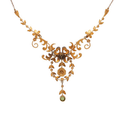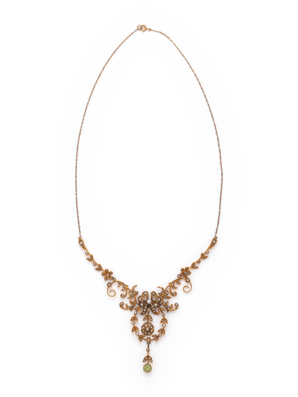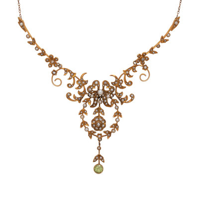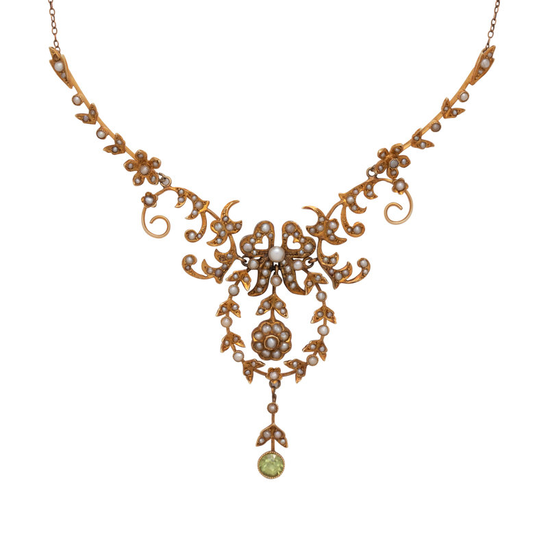 ANTIQUE, YELLOW GOLD, SEED PEARL AND PERIDOT NECKLACE