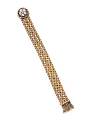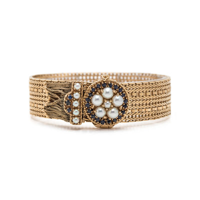 Consisting of a mesh link bracelet with adjustable clasp containing 11 pearls and 23 round mixed cut sapphires. Up to 8 1/4 inches long.