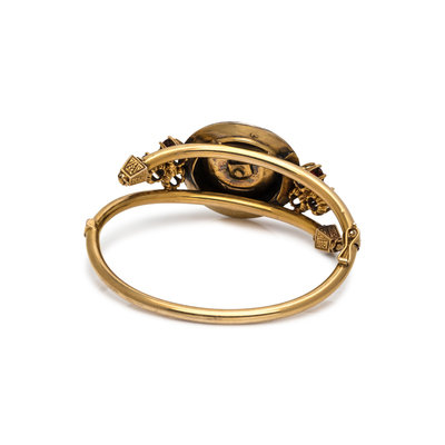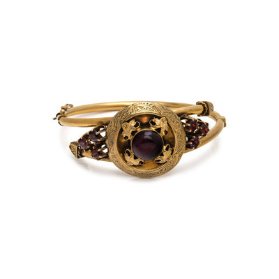 Containing six round mixed cut garnets and one round paste cabochon, hinged with side clasp. 6 1/2 inches inner circumference.
