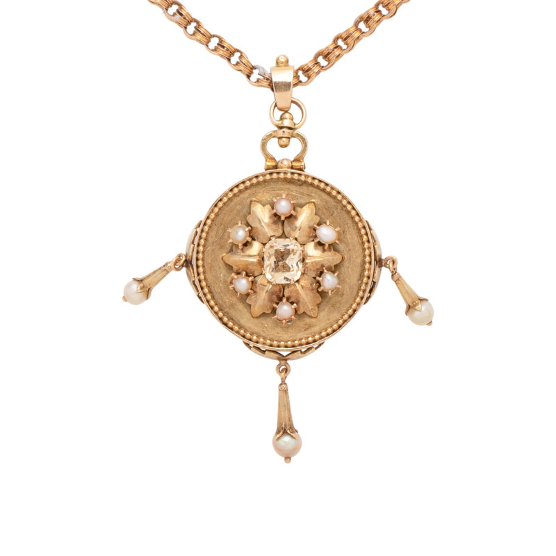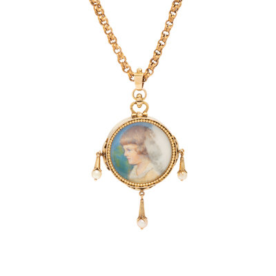 YELLOW GOLD, TOPAZ, PEARL AND PORTRAIT NECKLACE