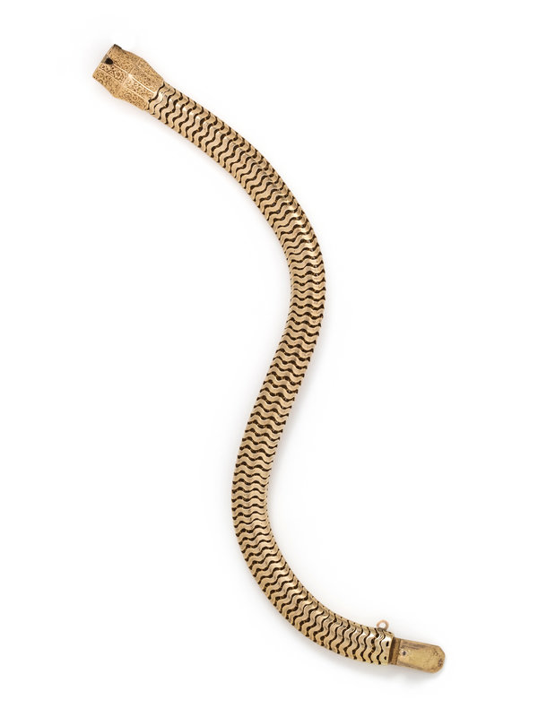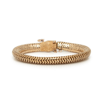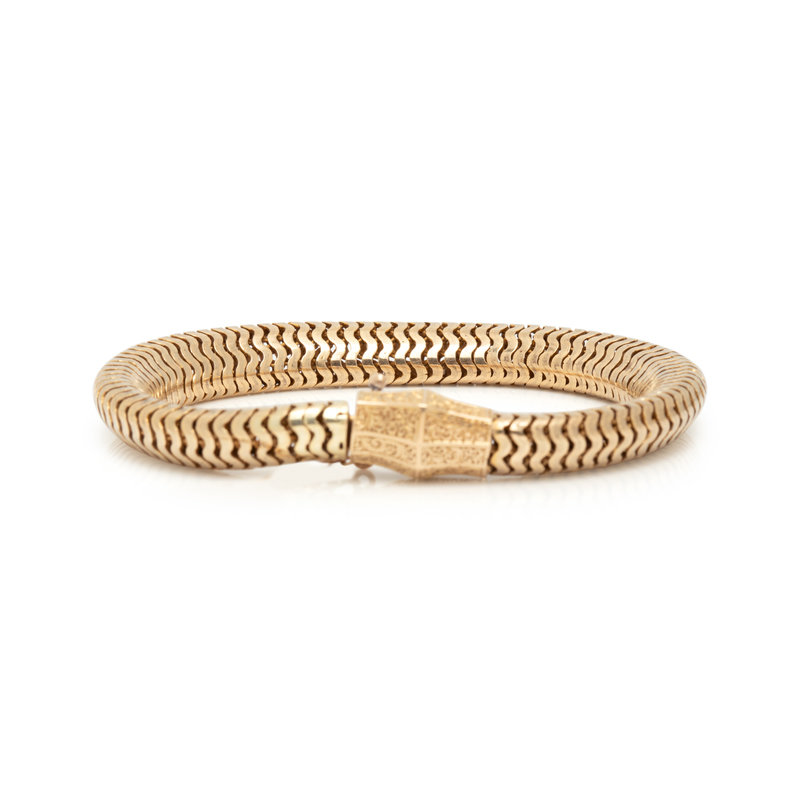 Consisting of an oval snake chain bracelet with foliate engraved clasp. 7 1/4 inches long.