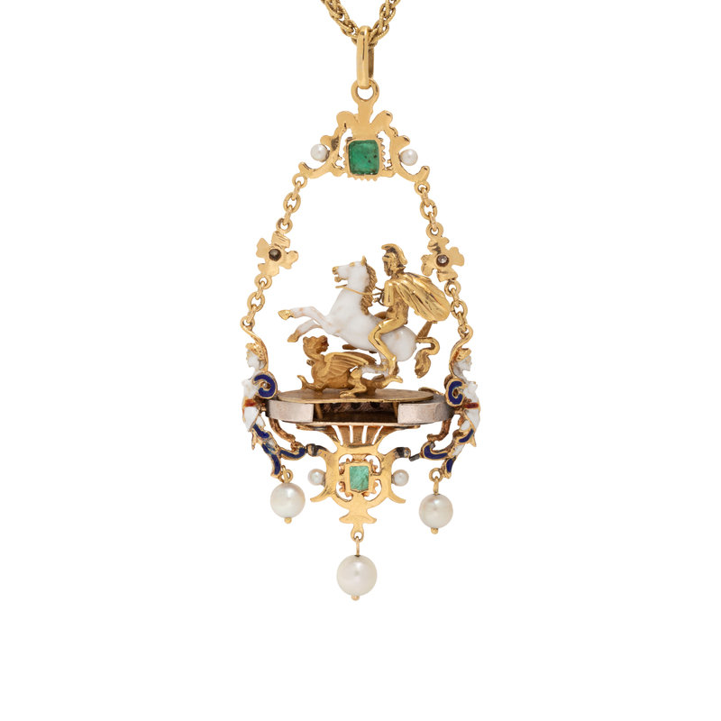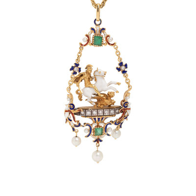 DIAMOND, GEMSTONE AND POLYCHROME ENAMEL 'SAINT GEORGE SLAYING THE DRAGON' PENDANT/NECKLACE