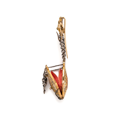 Consisting of a gold-filled and green enamel belt clip with silver chains and satyr mask motif suspending a gold-filled foliate motif hinged etui with white, green and red enamel. 6 5/8 inches long.