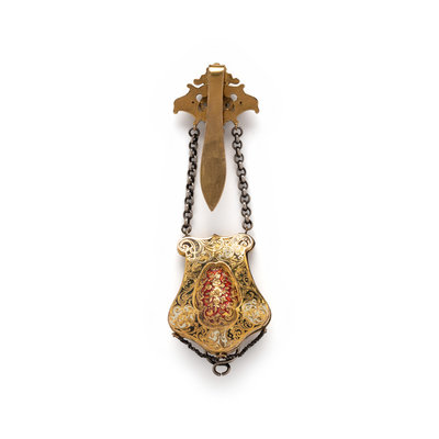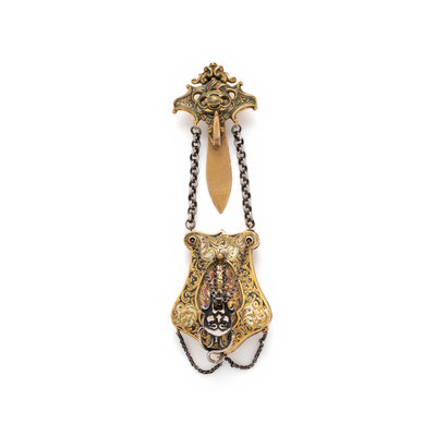 ANTIQUE, GOLD-FILLED, SILVER AND ENAMEL CHATELAINE