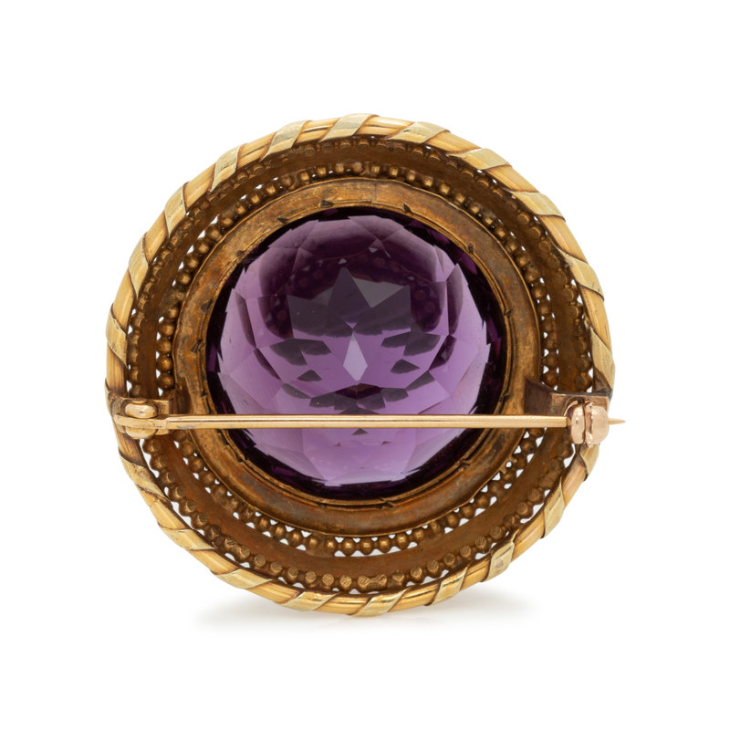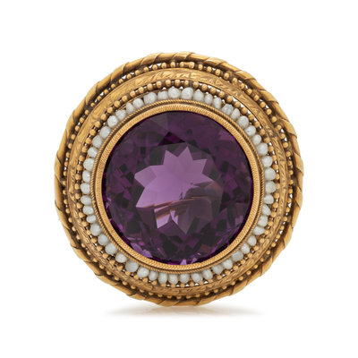 Containing one round mixed cut amethyst measuring approximately 24.00 mm in diameter with a seed pearl (origin not tested) and engraved gold surround. Mounted in yellow gold. 1 1/2 inches wide.