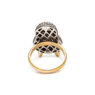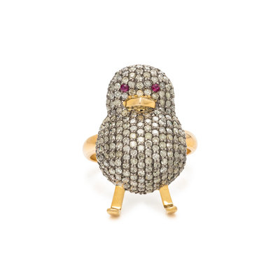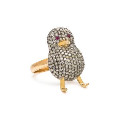 Containing numerous single cut diamonds and two ruby eyes. Mounted in yellow gold and silver. Ring size 5 3/4.