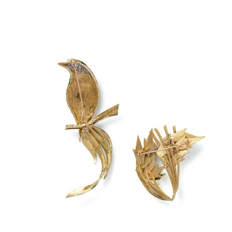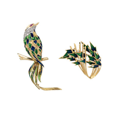 Consisting of a bird brooch containing 18 single cut diamonds and one marquise cut ruby eye with blue and green enamel feathers, together with a brooch containing eight single cut diamonds with blue and green enamel. Mounted in yellow gold. 3 1/4 x 2 1/4 inches and 1 3/4 x 2 inches.