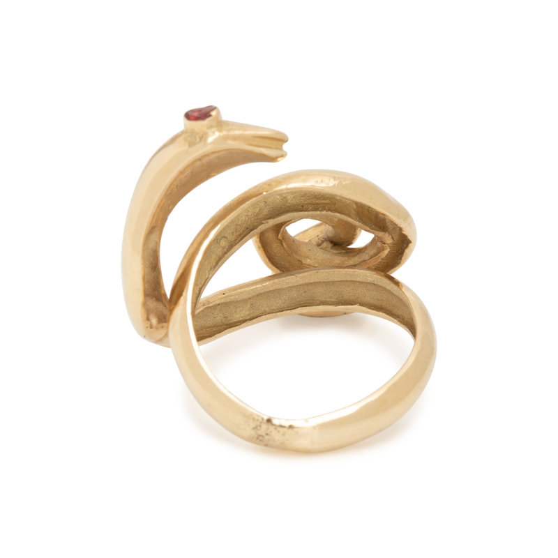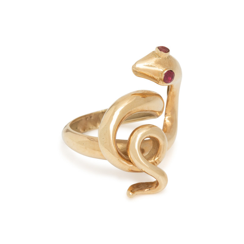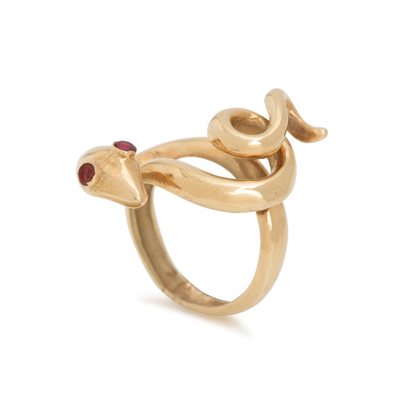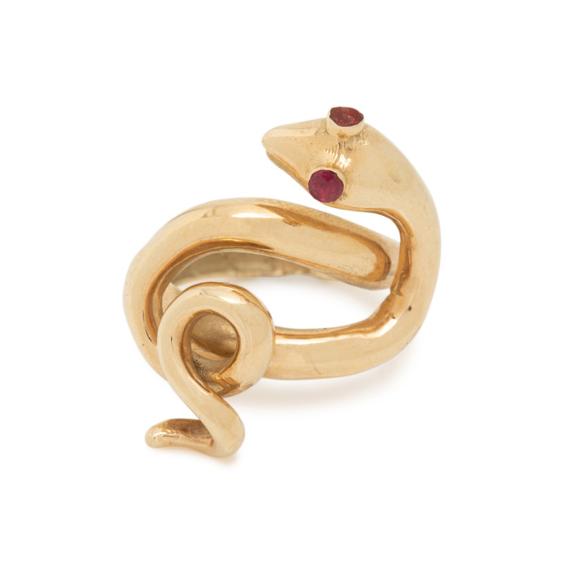 Consisting of a curling snake with two ruby eyes. Ring size 5.