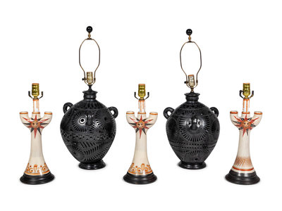 five total includes two pierced blackware lamps and three 3 light candelabra form pottery lamps.