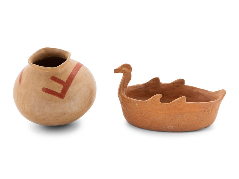 thirteen total including a large piggy bank by Taller De Juan, a blackware vase, two bird form bowls and a pottery angel