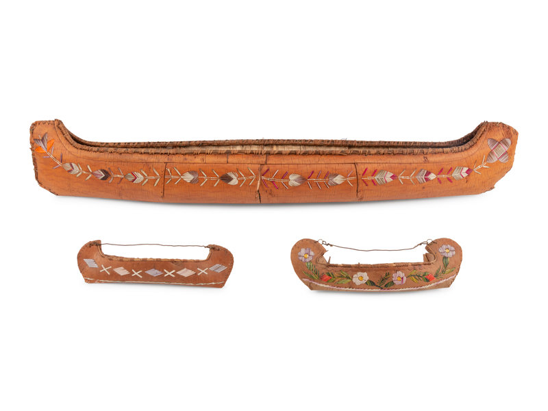group of four includes 4 birchbark canoes, including 3 with quilled decorations.