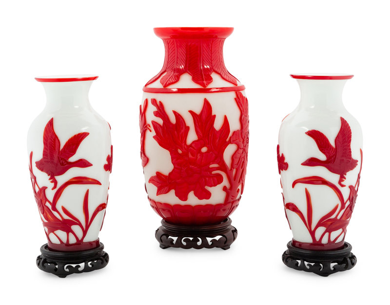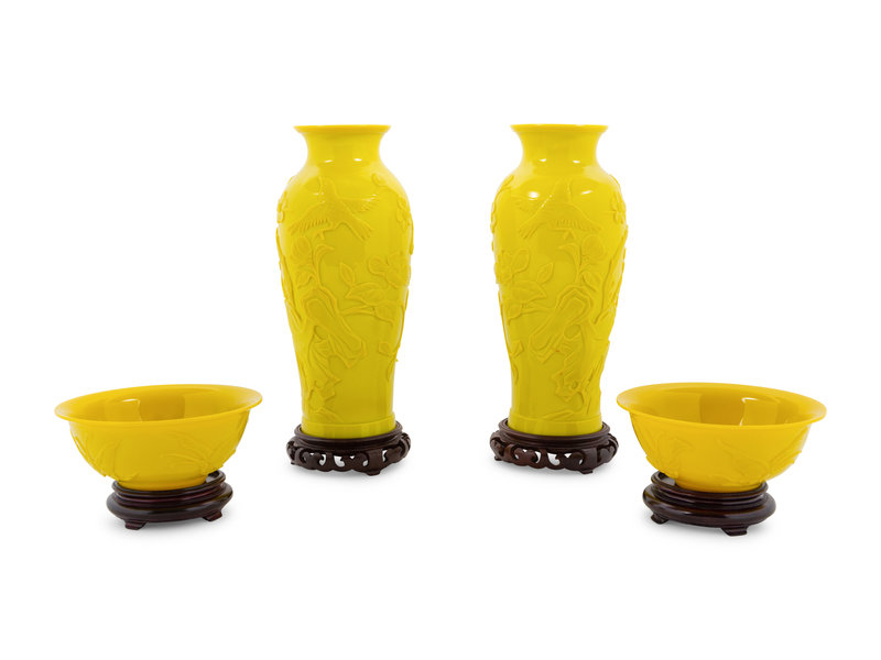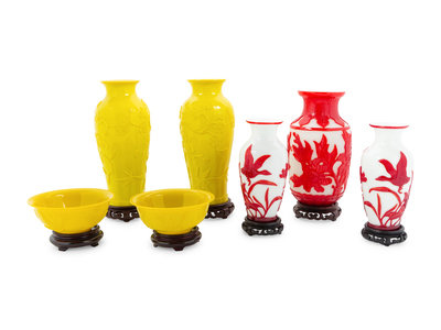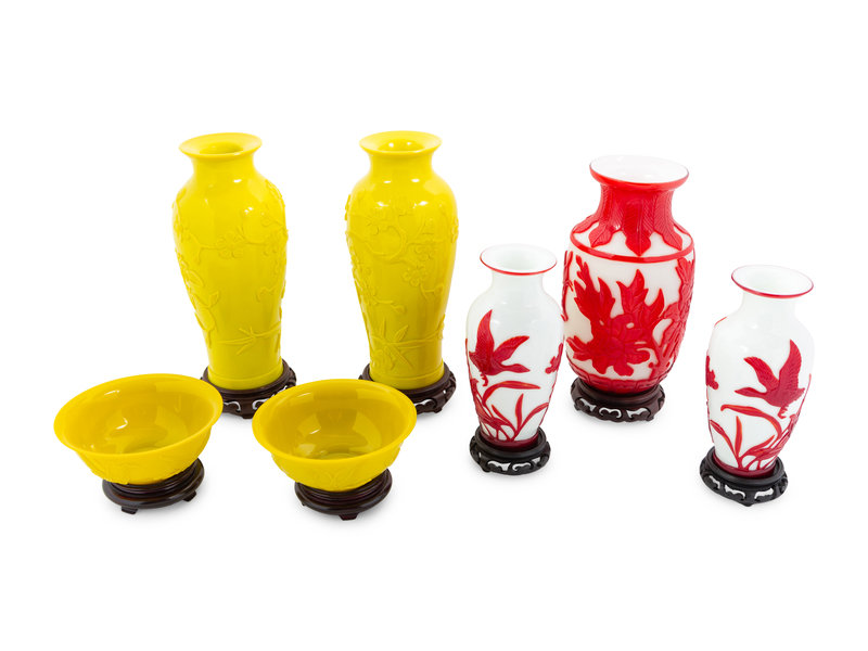 comprising a pair of yellow bowls, a pair of yellow vases, a pair of small red overlay white vases, and a red overlay white yen-yen vase.
