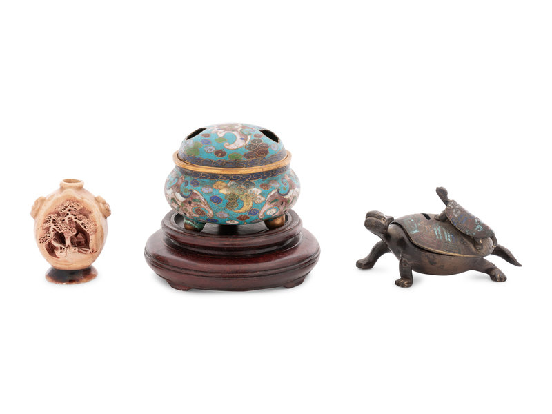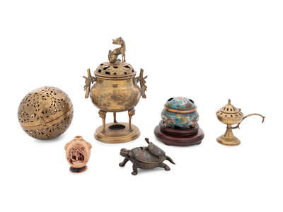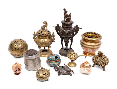 group of twelve includes six brass incense burners, a Chinese cloisonné incense burner, a Chinese bronze incense burner, a mixed metal incense burner, an enameled turtle incense burner, and two pottery incense burners.