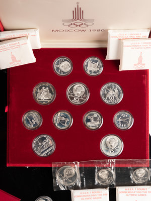 comprising a 1987 1, 3 and 5 Ruble 70th Anniversary of the Russian Revolution 3-coin set; nine 9-coin mint sets (1971 9x2), 1974, 1975, 1976, 1977, 1978, 1979, 1980); Seven 1980 Summer Olympic Games 1 Ruble Coins, 1980 Summer Olympic Games 5 Ruble Coin, 28-Coin 1980 Summer Olympic Games Silver Coin Cased set and a 1947 4-Bank Note commemorative set, together with a 1980 Summer Olympic Games: Olympic Flame commemorative stamp.
