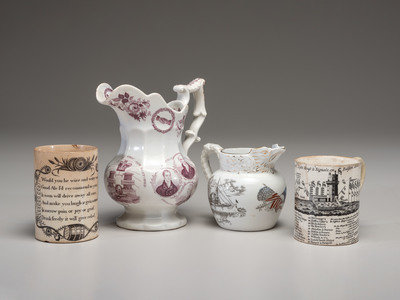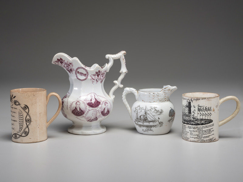 Two Commemorative Creamware Pitchers and Two Ale Mugs