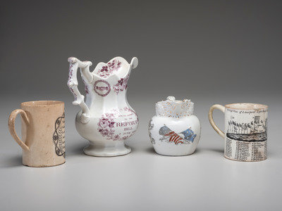 including a Cook Pottery Flagship Olympia creamer, a Reform Bill pitcher, a mug depicting An East View of Liverpool Light House & Signals and one with drinking poem.