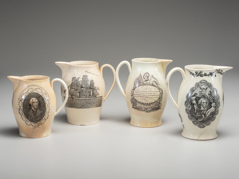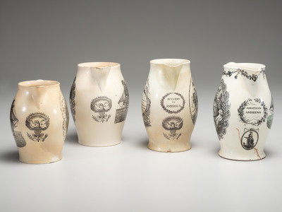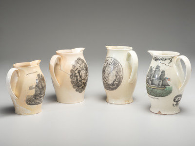 A Wedgwood Britannia and Etruria Panel and Nautical Creamware Pitchers