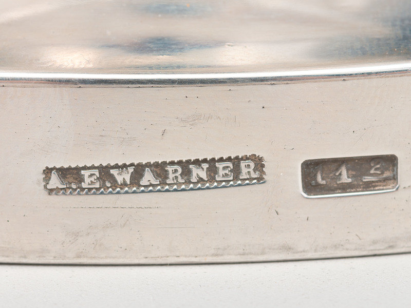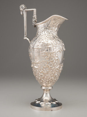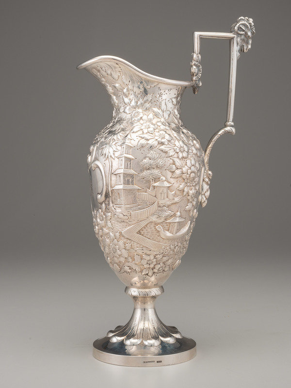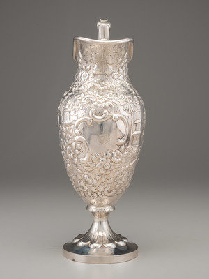 with coat of arms engraving to cartouche and engraved on interior rim of foot Presented to M.M.T. 12th June 1865 by her Grand Father and Mother, Johnson.