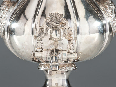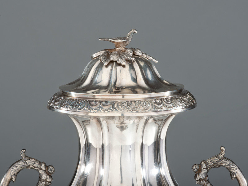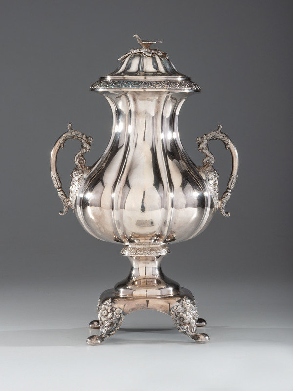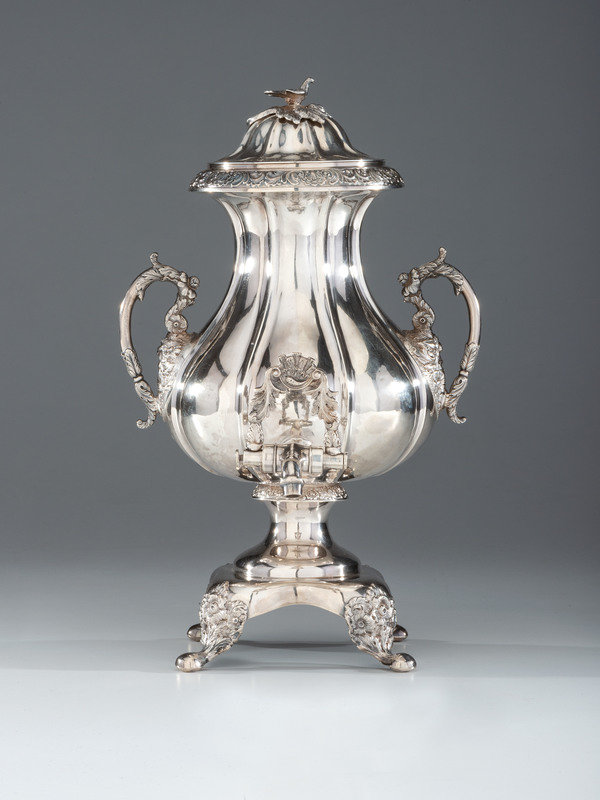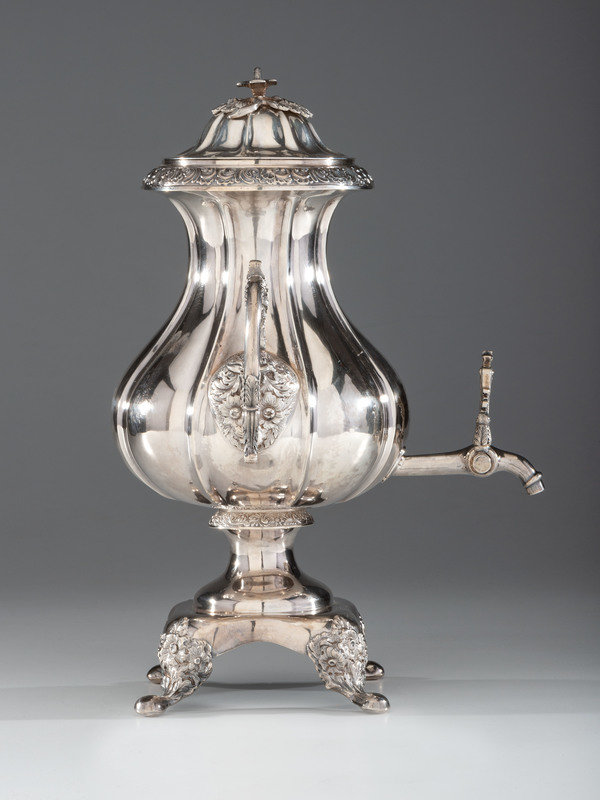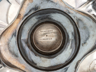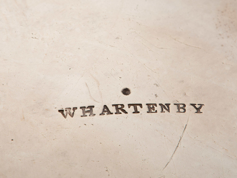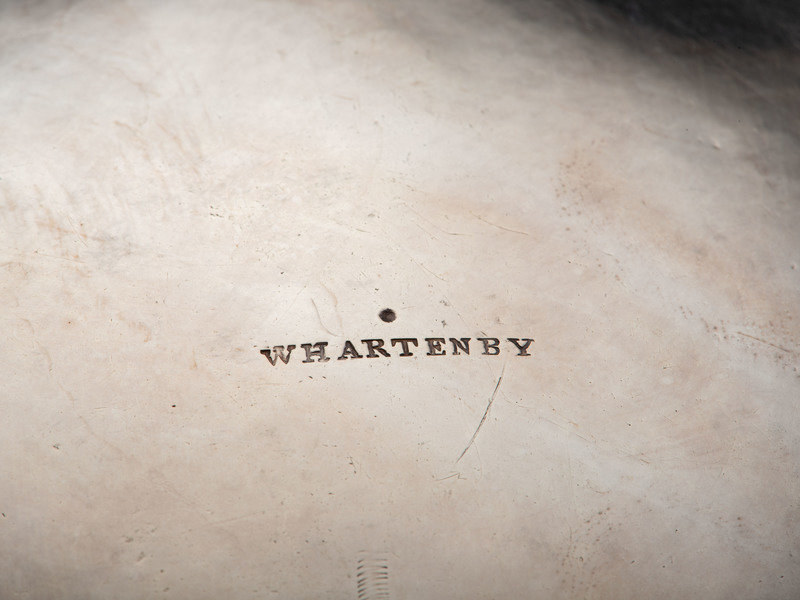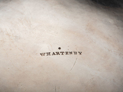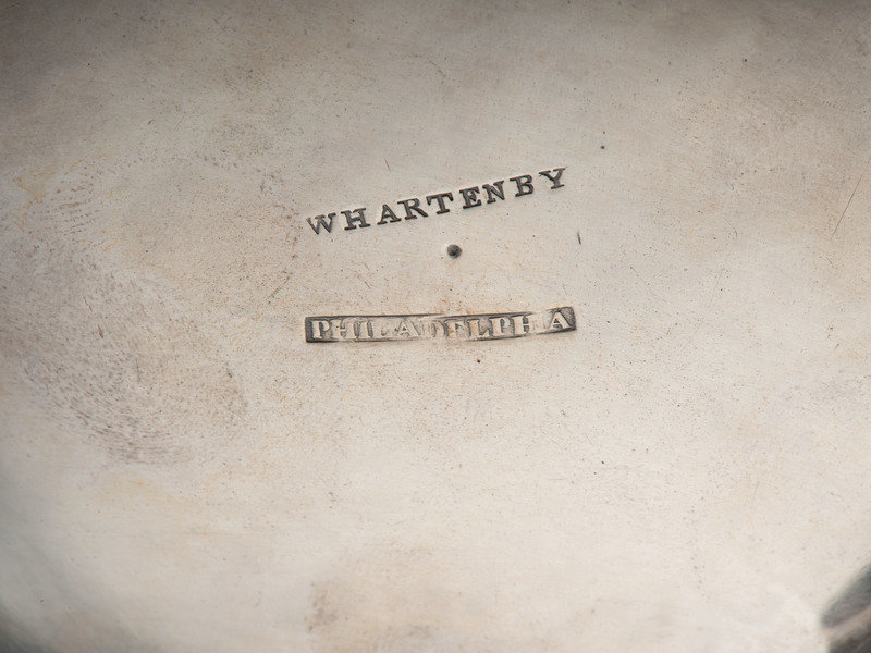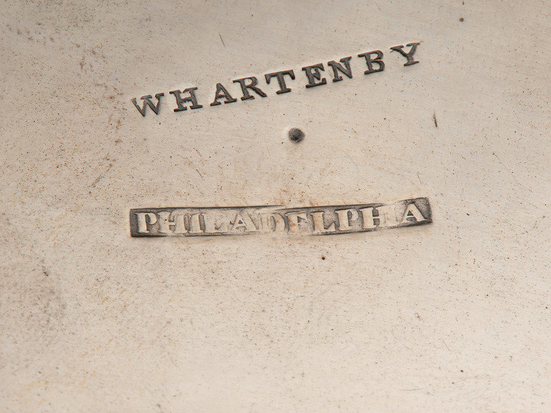 both pots and hot water urn stamped Whartenby, lidded bowl stamped Whartenby / Philadelphia.