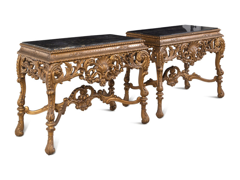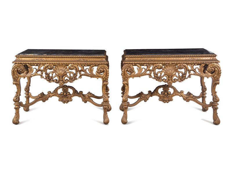 A Pair of Italian Baroque Style Giltwood Composition Marble-Top Console Tables
