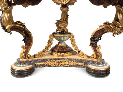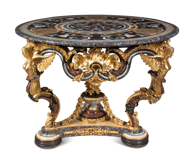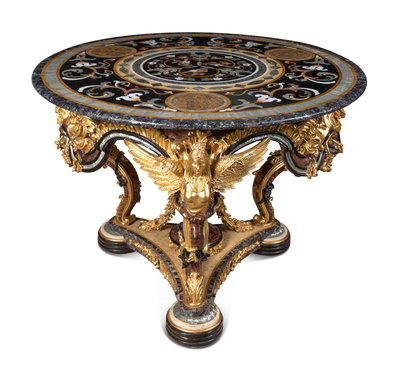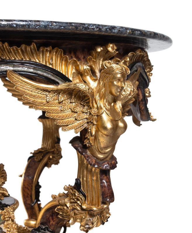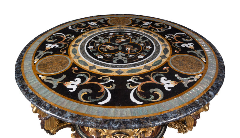 A Continental Parcel Gilt and Ebonized, Pietra Dura and Abalone Inlaid Center Table