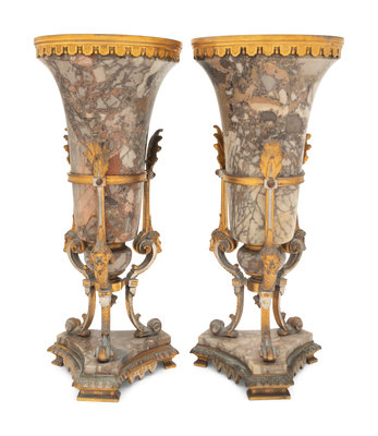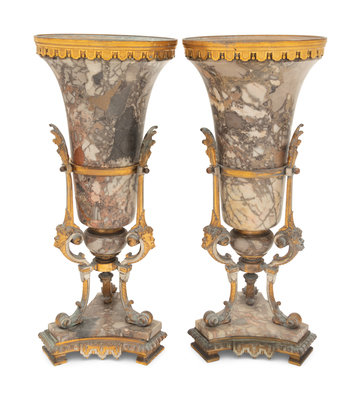 A Pair of Neoclassical Gilt Bronze Mounted Marble Vases