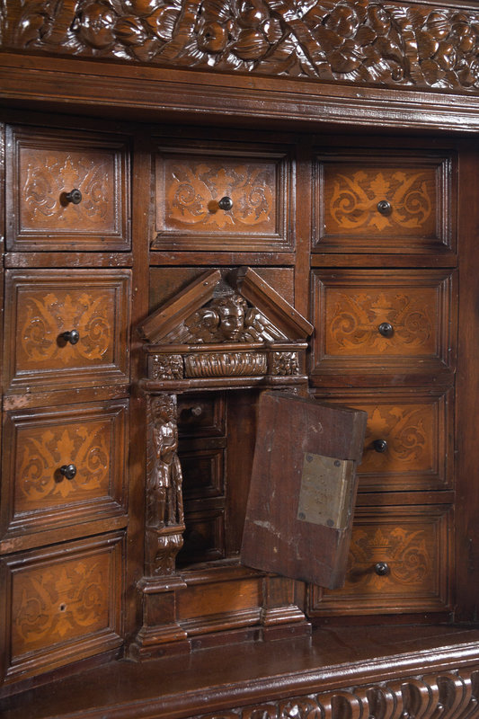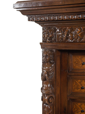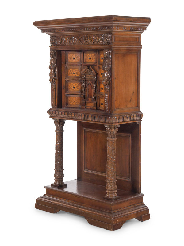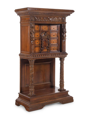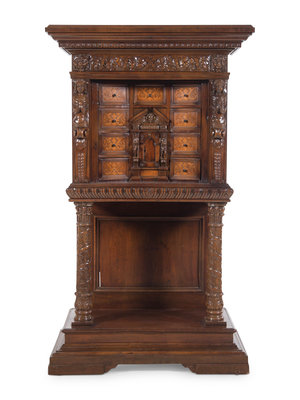 A Renaissance Revival Carved Walnut and Marquetry Collector's Cabinet