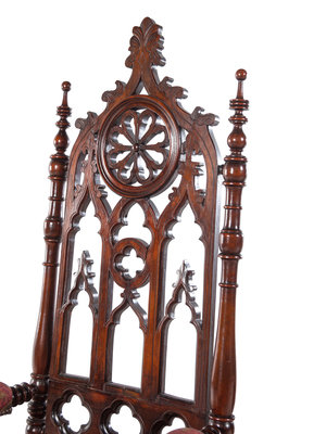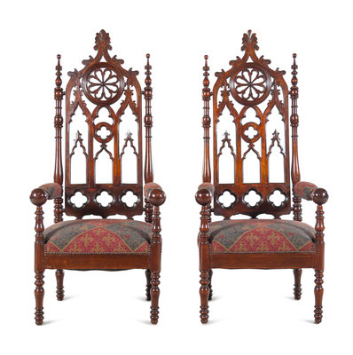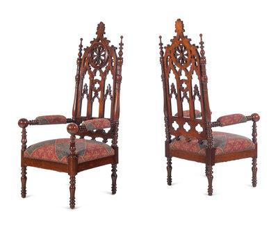 A Pair of Gothic Revival Carved Walnut Armchairs