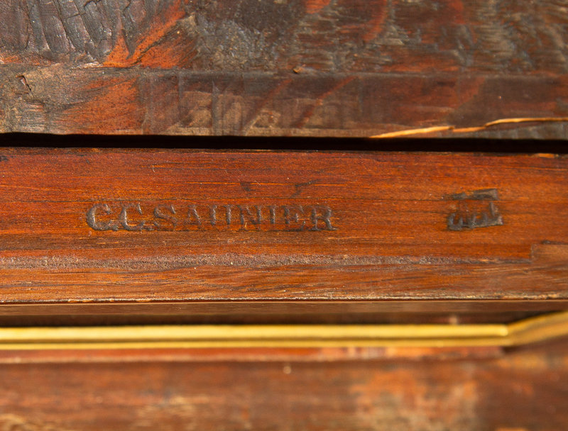 stamped C.C. SAUNIER and JME to the underside, the top with an inset leather writing surface.