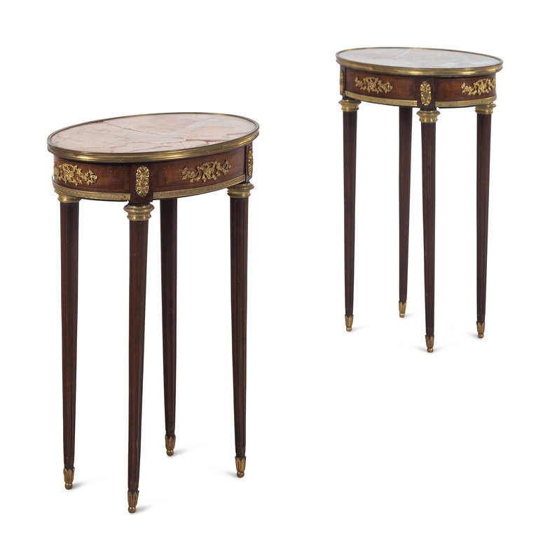 A Pair of Louis XVI Style Gilt Bronze Mounted Marble-Inset Side Tables