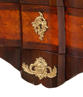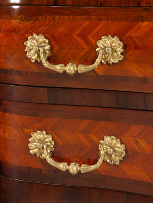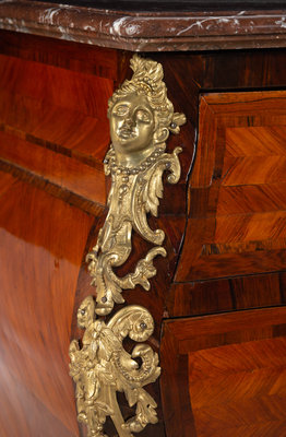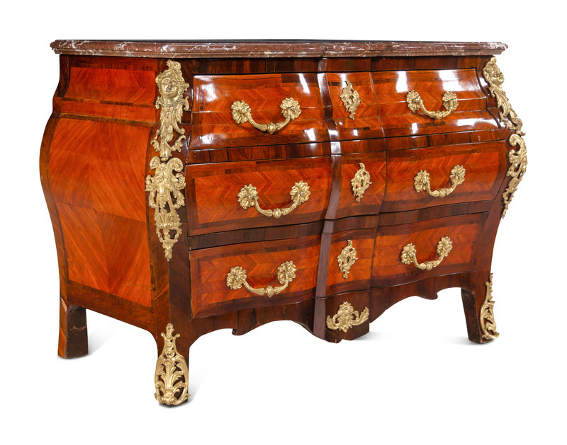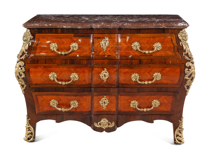 A Régence Style Gilt Bronze Mounted Parquetry Marble-Top Bombe Commode