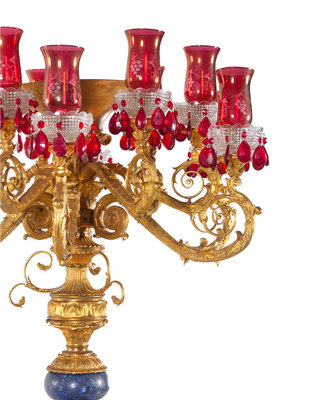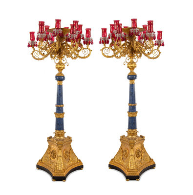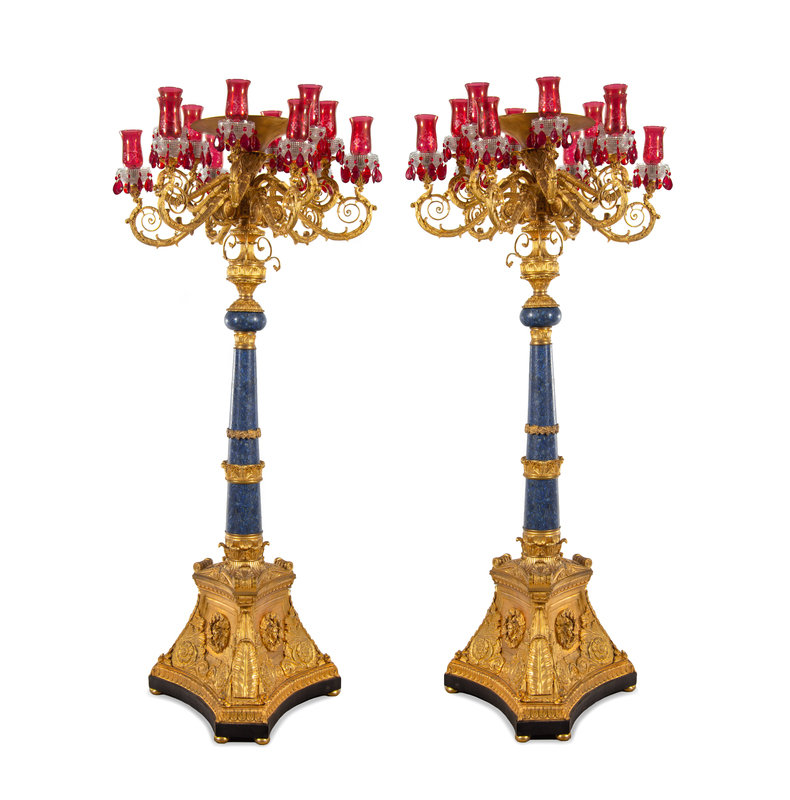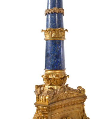 A Pair of Monumental Empire Style Gilt Bronze and Lapis Lazuli Torchères