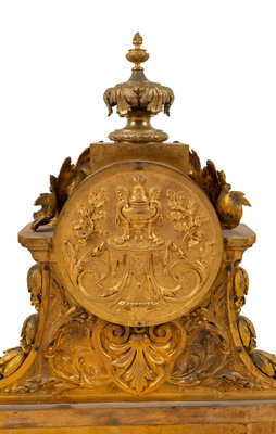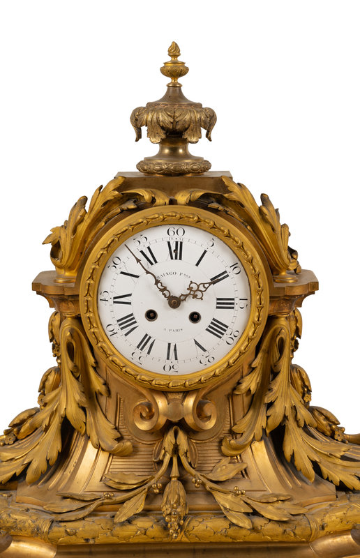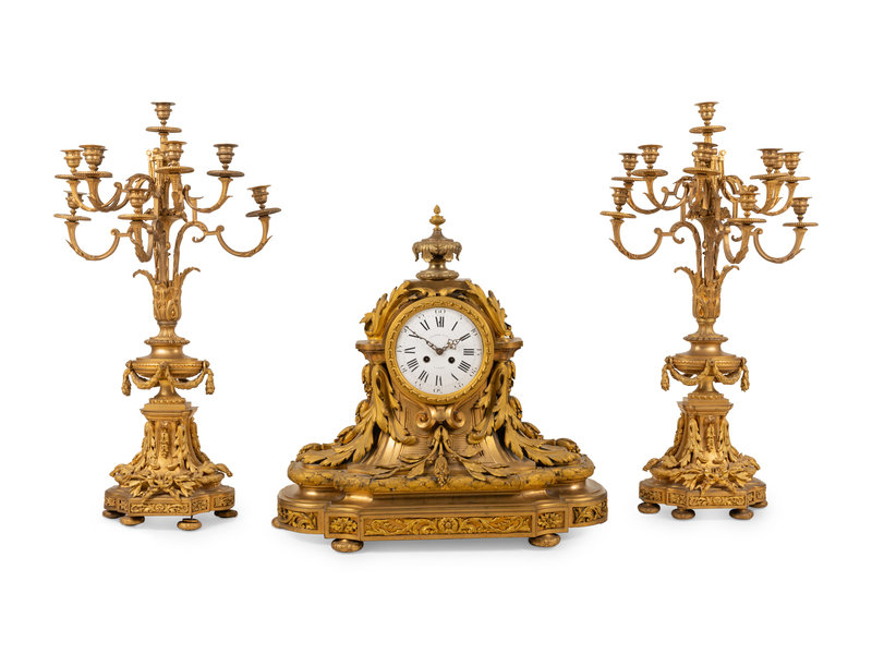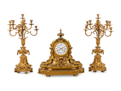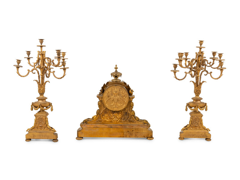 comprising a mantel clock and a pair of large 9-light candelabra, the enameled dial signed RAINGO FRÈS. À PARIS, the movement with a RAINGO FRÈRES seal and further numbered 10 and 183.